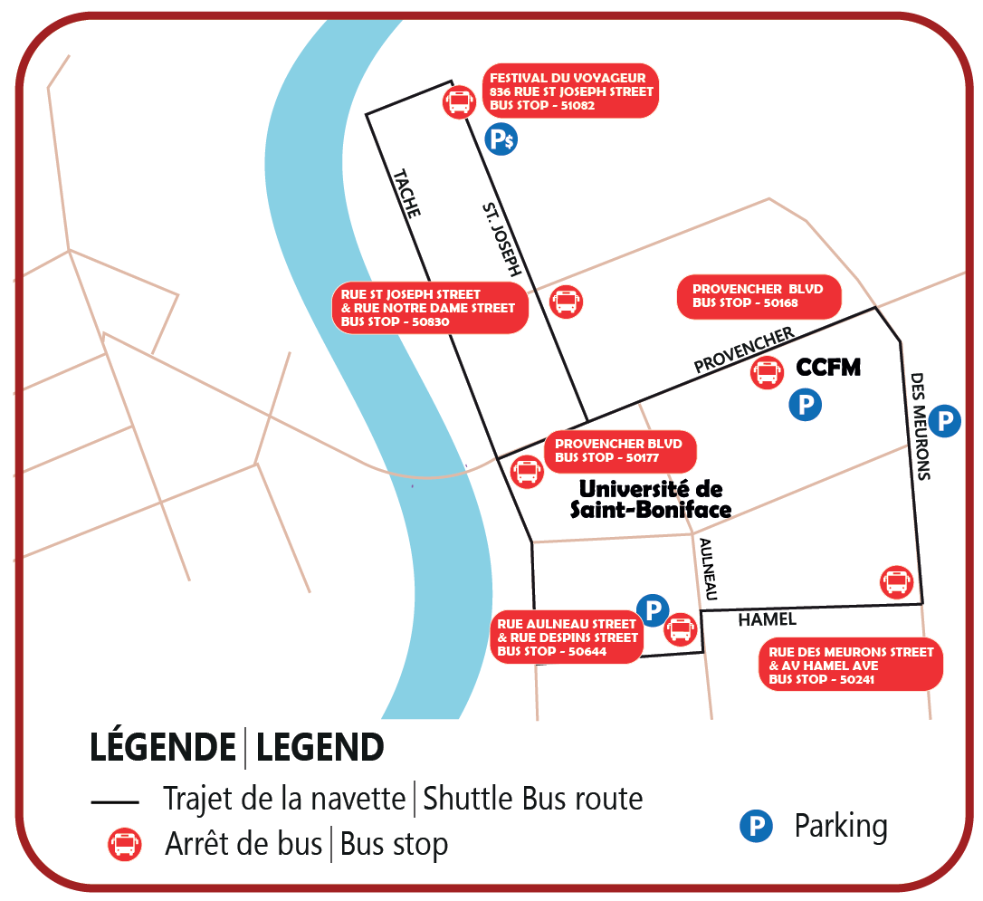 Le stationnement au parc et dans les environs est limité. Nous encourageons les festivaliers de considérer d'autres moyens de transport que leur voiture pour se rendre au Festival du Voyageur.